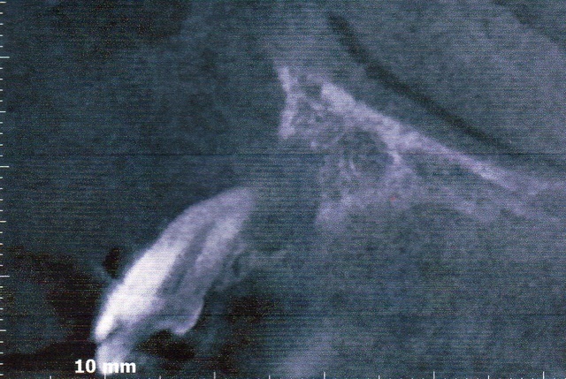パノラマ写真(2D)では、根尖部に黒い影がみえます。
